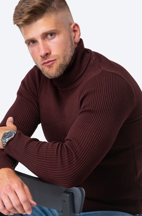Стильная бордовая водолазка с высоким воротником для мужчин выполнена из вязаного трикотажа: в ней будет уютно и тепло в прохладную погоду. Шерстяной джемпер в рубчик из мягкой пряжи с акрилом не колется, он невероятно мягкий и приятный к телу. Благодаря фактурной вязке теплая водолазка хорошо тянется.