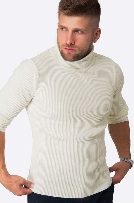 Стильная водолазка с высоким воротником для мужчин выполнена из вязаного трикотажа: в ней будет уютно и тепло в прохладную погоду. Шерстяной джемпер в рубчик из мягкой пряжи с акрилом не колется, он невероятно мягкий и приятный к телу. Благодаря фактурной вязке теплая водолазка кремового оттенка хорошо тянется.