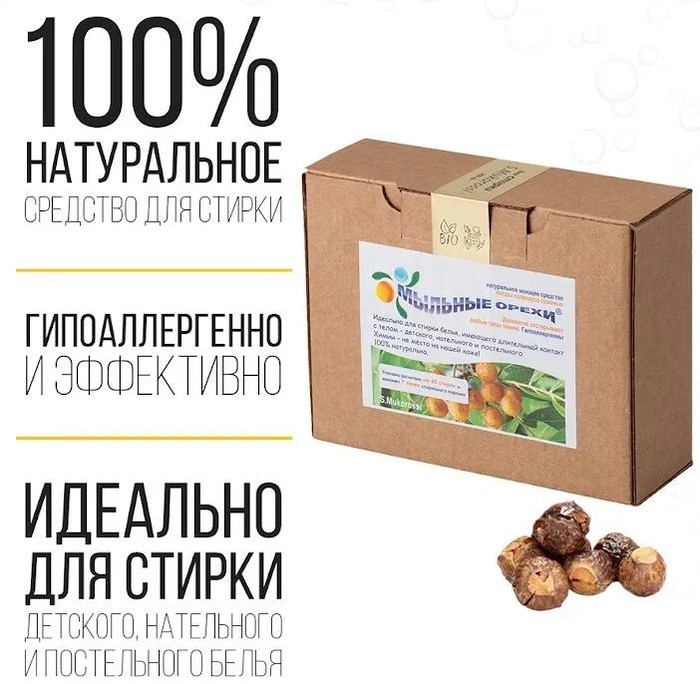 Мыльные орехи пригодны для стирки любых типов тканей: хлопок, лен, шерсть, шелк, синтетика, цветные и смесовые ткани.