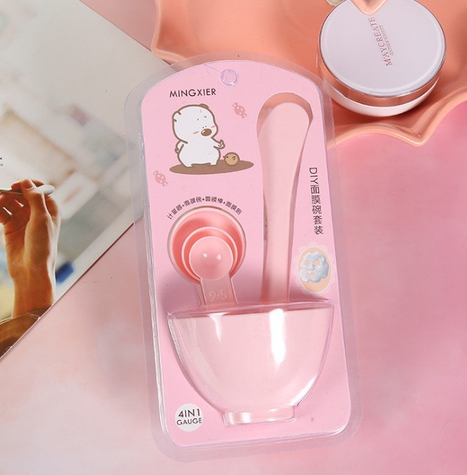 - Пластиковую чашу, объемом в 100 мл. Она достаточно вместительная и устойчивая.- Комплект из 3-х мерных ложек разного размера: 2,5мл, 5мл и 15мл.- Пластиковый шпатель – 15см., им удобно смешивать все составляющие маски, также можно наносить более плотные текстуры, которые тяжело нанести с помощью кисти.- Синтетическая кисть – 14,5см. Идеально подходит для нанесения любой жидкой и гелеобразной консистенции масок. Также можно с ее помощью нанести косметические кремообразные средства (маски/скрабы и т.д). Кисть средней жесткости, прочная, ворсинки не выпадают. Набирает необходимое количество маски и равномерно распределяет по всей поверхности лица.