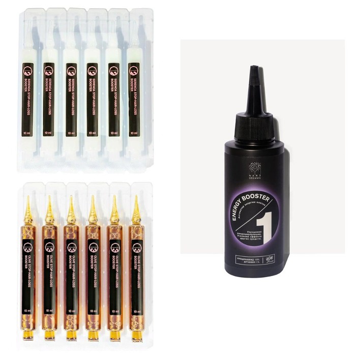 ** 1. Набор №2 Nano Organic для укрепления волос включает в себя набор ампул с сыворотками №2 (6 апмул*10 мл) и №3 (6 ампул*10 мл) и Сыворотку для кожи головы ENERGY BOOSTER/Активатор энергии клеток, 100 мл.