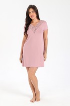 Сорочка женская из трикотажного полотна «кулирка» слегка расширенная книзу, без рукавов. Кружевные детали кокетки на полочке образуют V-ный вырез горловины. На нижней части полочки по шву притачивания кружевной кокетки заложены симметричные складки, проймы окантованы основным материалом.