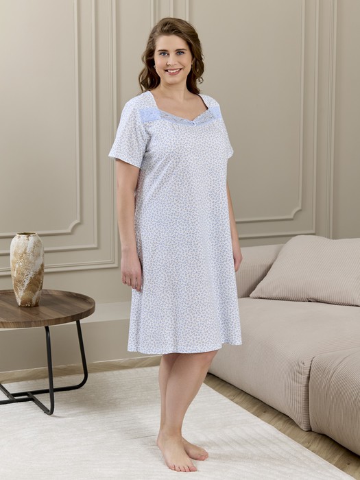 Сорочка женская из трикотажного полотна «кулирка» с набивным рисунком, свободного кроя, слегка расширенная книзу, с короткими втачными рукавами. Полочка – с двойными кокетками, кружевом в шве соединения кокеток с основной деталью и декоративной вставкой «петлей» для достижения небольшого эффекта драпировки. Основная деталь переда присборена по шву притачивания кокетки.