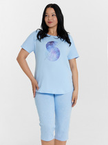 Сорочка женская из трикотажного полотна «кулирка» с набивным рисунком, расширенная книзу, без рукавов, с расширенной, углубленной горловиной овальной формы и притачной кокеткой по переду. Срезы пройм и горловины, а также шов притачивания кокетки, обработаны фасонной эластичной тесьмой с кружевным краем. Низ изделия обработан узкой обметочной строчкой.