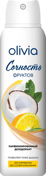 Представляем Вам новую линию парфюмированных женских дезодорантов Olivia с приятными ароматами, которые подарят ощущение комфорта и уверенности на весь день. Манящие ноты дезодоранта помогут раскрыть Вашу чувственность и изысканный стиль. Позволяют коже дышать. Без парабенов и солей алюминия. Надежно защищают от неприятного запаха до 48ч. Не оставляют следов на одежде. Сочность фруктов - аромат цитруса и кокоса.