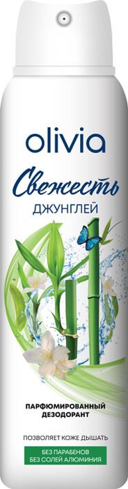 Представляем Вам новую линию парфюмированных женских дезодорантов Olivia с приятными ароматами, которые подарят ощущение комфорта и уверенности на весь день. Манящие ноты дезодоранта помогут раскрыть Вашу чувственность и изысканный стиль. Позволяют коже дышать. Без парабенов и солей алюминия. Надежно защищают от неприятного запаха до 48ч. Не оставляют следов на одежде. Свежесть джунглей - аромат бамбука и цветущего чая.