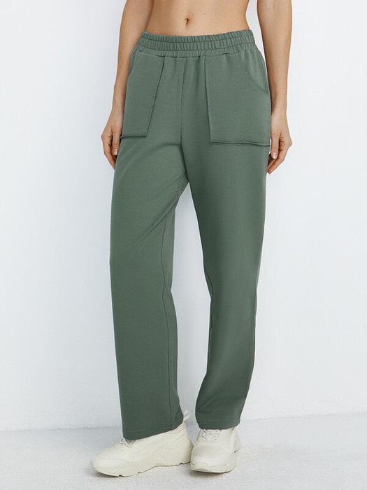 Женские прямые брюки с накладными карманами и поясом на резинке.