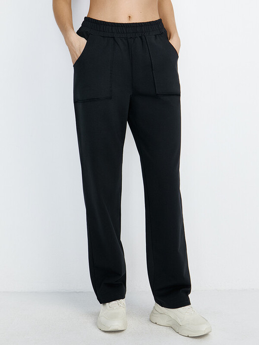 Женские прямые брюки с накладными карманами и поясом на резинке.