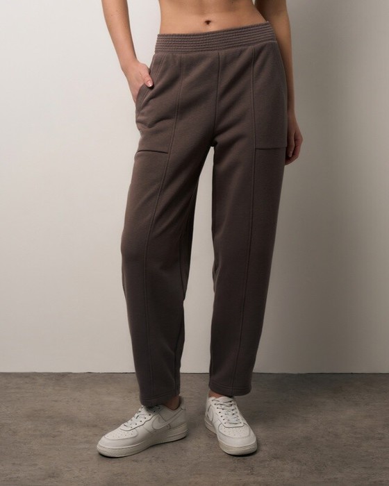 Брюки-бананы. Передние половинки брюк со швом. Накладные карманы по передним боковым половинкам брюк,между швами. Пояс из основной ткани, отстрочен.