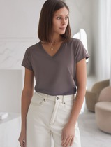 Футболка свободного силуэта. Спущенное плечо. Горловина из двух деталей, из рибаны. Укрепление бейкой плечевых швов и горловины спинки.