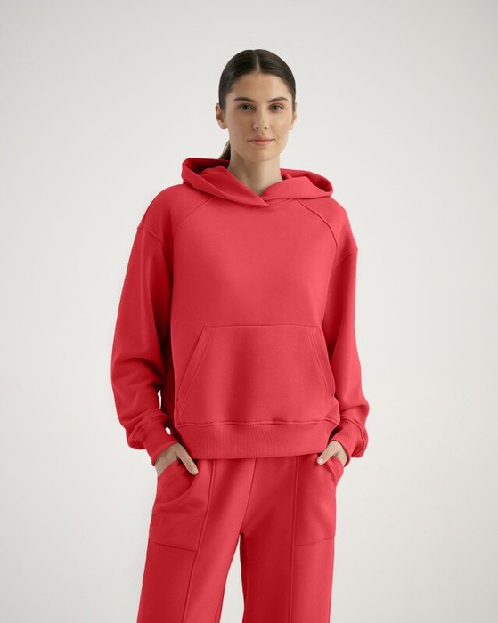 Худи женский свободного силуэта. Двойной капюшон с одним швом, притачные кокетки по переду, втачной рукав с локтевым швом. Карман "кенгуру".  Манжеты и пояс из кашкорсе.