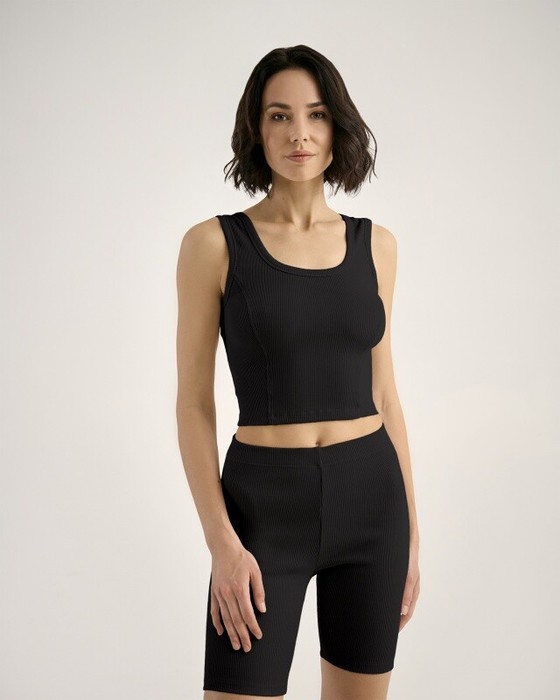 Майка из кашкорсе, облегающая с отстроченными рельефами. Горловина и проймы окантованы основной тканью