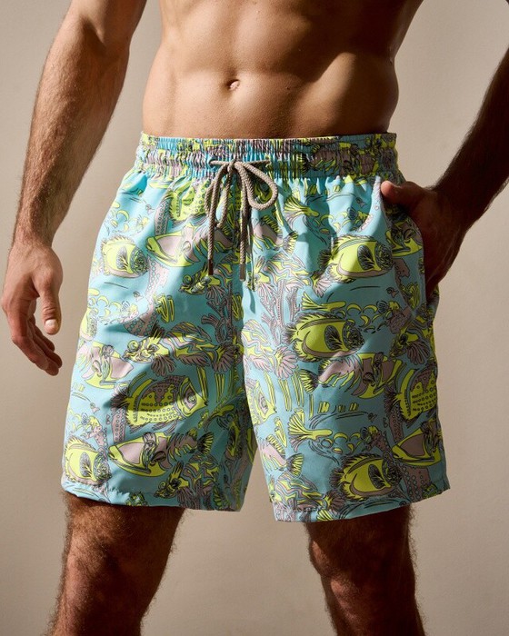 Плавательные шорты. Карманы в боковых швах. Задний карман с клапаном на правой задней половинке шорт. Пояс цельнокроенный, отстроченный, внутри с резинкой и шнурком.