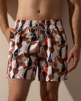 Плавательные шорты. Карманы в боковых швах. Задний карман с клапаном на правой задней половинке шорт. Пояс цельнокроенный, отстроченный, внутри с резинкой и шнурком.