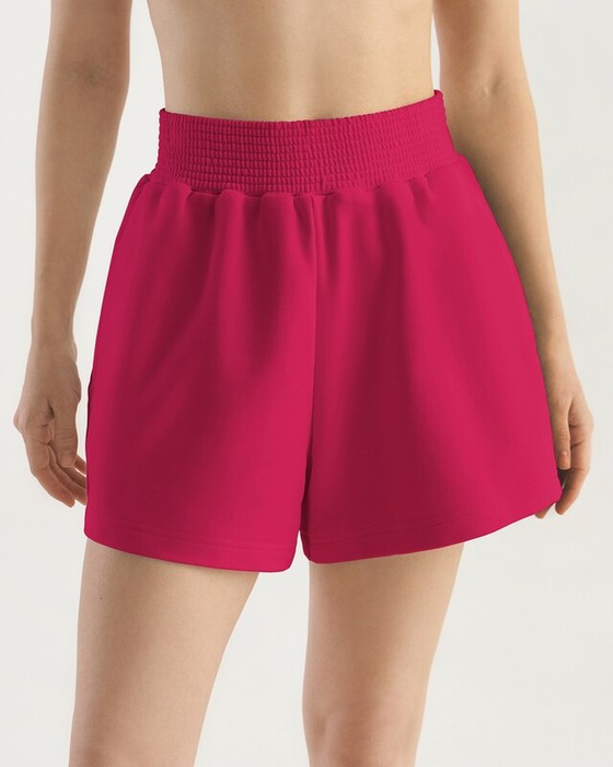 Шорты расклешенные книзу, высокая талия. Пояс из основной ткани, отстроченный