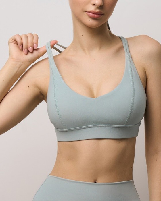 Топ спортивный с рельефными швами по груди ,v-образным вырезом .На плечеках двойные  завязки -спагетти  переплетенные на спине.