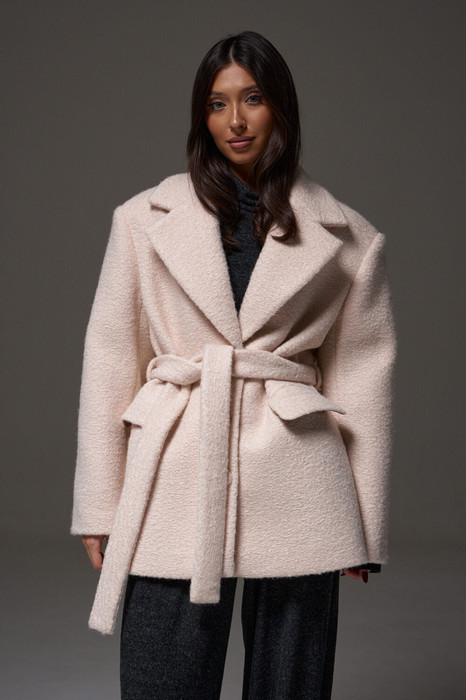 Полупальто однобортное прямого кроя, выполнено из полотна бежевого цвета ворсистой текстуры. Характеристики: прямой крой, брендированная подкладка, воротник с остроугольным лацканом, застежка центральная на петли - пуговицы, по линии талии шлевки, в комплекте пояс из ткани основного изделия, по переду функциональные карманы, рукав втачной, спинка цельнокройная. Длина по спинке 78 см, длина рукава 60 см.