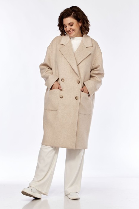 Пальто женское, свободного кроя с двухбортной застежкой на петли ипуговицы, с открытыми бортами,линия плеча спущена. По спинке средний шов, по переду накладные карманы. Рукав втачной 2-шовный. Воротник стояче-отложной.