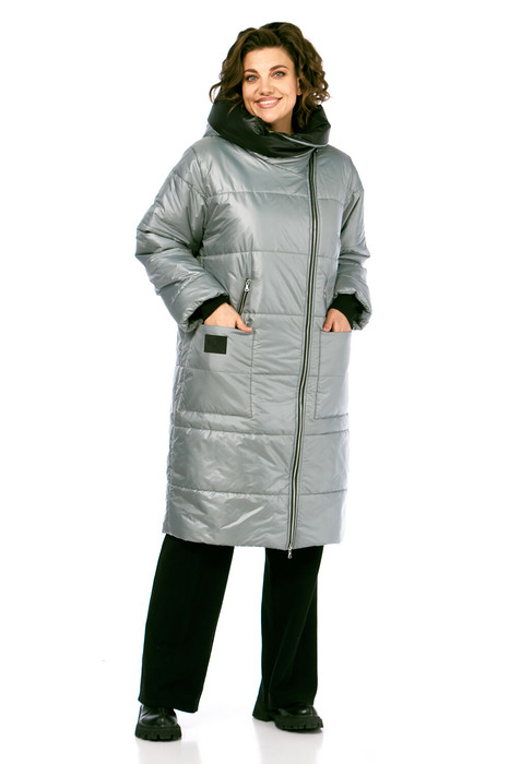 Пальто женское утепленное свободного кроя с ассиметричной застежкой на "молнию". Перед с прорезными карманами с "молнией" и накладными карманами. Правый накладной карман с отделочной нашивкой. Рукав втачной одношовный с трикотажным манжетом выходящим из-под подгибки. Объмный капюшон выполнен из 2-ух видов ткани. Утеплитель Hoopon 200, температурный режим до -10 градусов.