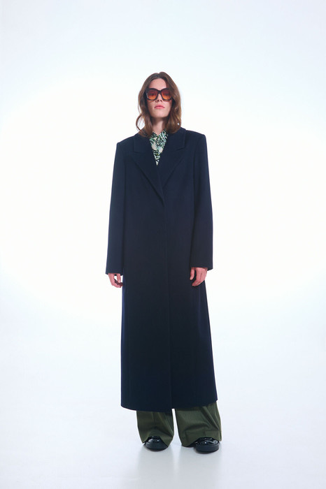 Пальто женское демисезонное, прямого силуэта однобортное, длина «миди», на подкладке. На переде карманы в рельефе, застежка потайная на петли и пуговицы. В нижней части среднего шва спинки шлица. Рукава двухшовные длинные, в локтевом шве отлетная шлица на 4 пуговицы и не пробивные петли. Воротник и лацкана отложные.