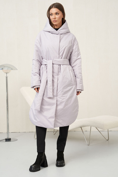 Свободный оверсайз силуэт, втачной покрой на заниженной линии плеча, центральная застёжка на тесьму-молнию и потайные кнопки, капюшон. Полочки с прорезными карманами с листочкой, по боковым швам фигурные разрезы. По низу рукава трикотажный манжет.