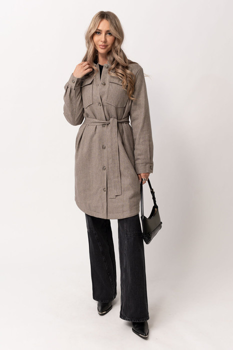 Пальто с центральной двубортной застежкой на петли и пуговицы, отложным воротником. По переду – накладные карманы с клапанами. Спинка цельная. Линия низа фигурная. В боковых швах расположены карманы. Рукав с отрезной манжетой. Пальто на подкладке.