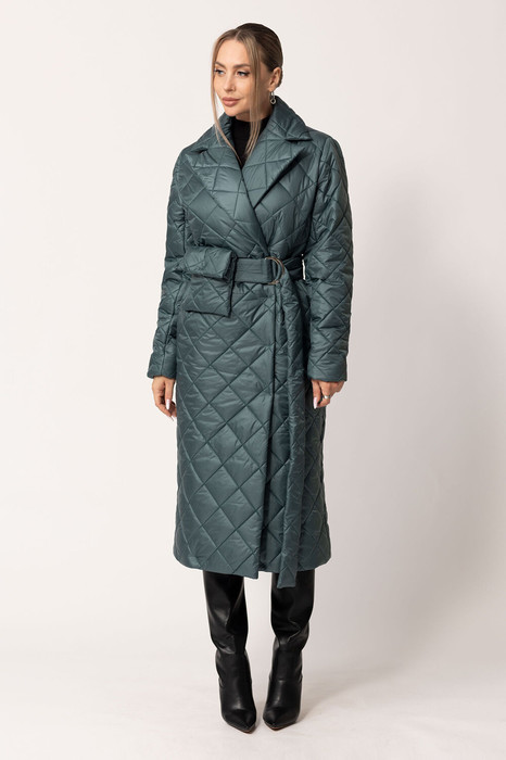 Пальто утепленное с центральной двубортной застежкой на пришивные кнопки, отложным воротником и лацканами. В боковых швах- карманы. Спинка цельная.. Рукав втачной, двухшовный. Пальто со съемным поясом и декоративной сумочкой.