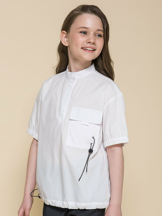 Школьная блузка для девочки. В составе ткани преобладает хлопок — изделие мягкое, дышащее и комфортное. Полиэстер помогает не терять форму и отличный внешний вид. Объемный крой, спущенное плечо – настоящий трендовый оверсайз. Модель с воротником-стойкой застёгивается на пуговицы по переду — ребёнку удобно надевать и снимать блузку через голову. По переду накладной карман с клапаном, который украшает эластичный световозвращающий шнур со стоппером — модно и актуально. В манжетах рукавов широкая внутренняя резинка — не давит и не впивается. По низу внутренний эластичный световозвращающий шнур со стоппером — можно регулировать объём и менять силуэт. На девочках с разными фигурами будет смотреться идеально. Удобно в течение всего дня.  Отличный вариант блузки для школы. Идеально белый цвет без желтого и серого оттенка.
