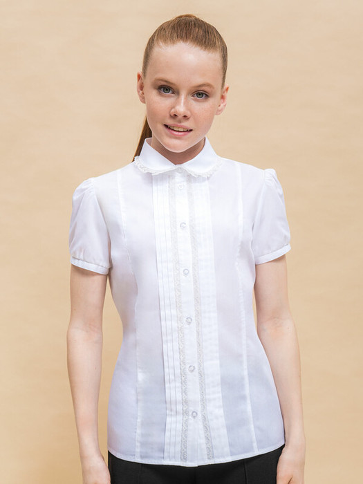 планки складки и тонкое изящное кружево. Модель дополнена короткими рукавами-фонариками на узкой аккуратной манжете. На манжетах есть дополнительная пуговица для их регулировки по ширине (для разной полноты руки). Небольшой круглый воротник с кружевом придаёт изделию женственности и изысканности. В составе ткани преобладает высококачественный хлопок — ребёнку не жарко, кожа дышит. Благодаря полиэстеру блузка в школу для девочки отлично сохраняет форму и первоначальный внешний вид. Модель однотонная, без принта. В ассортименте представлены блузки для девочек школьные универсальных цветов. Они легко сочетаются с различными брюками, юбками, сарафанами. Блузка детская подходит как для повседневной носки в школу, так и для более торжественного случая — в зависимости от того, с чем её надеть. Отличный выбор школьной формы для вашей девочки. Помните о правильном уходе за изделием: рекомендуется стирать при температуре не выше 30 °C, без предварительного замачивания, с изнанки. Это поможет сохранить качество и цвет блузки на долгое время.