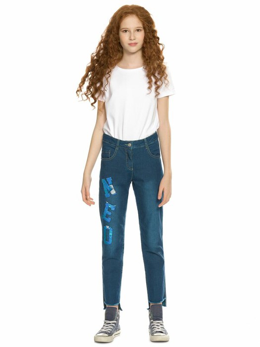 Джинсы для девочек. Новинка. Джинсы прямого силуэта SLIM из нового облегченного материала. Перепад длин по спинке и переду и необработанный низ в стиле деконструктивизм. Правая половинка джинсов украшена буквами-нашивками  из переливающихся переворачивающихся пайеток. Полукруглые боковые карманы спереди и накладные карманы на спинке, металлическая фурнитура.