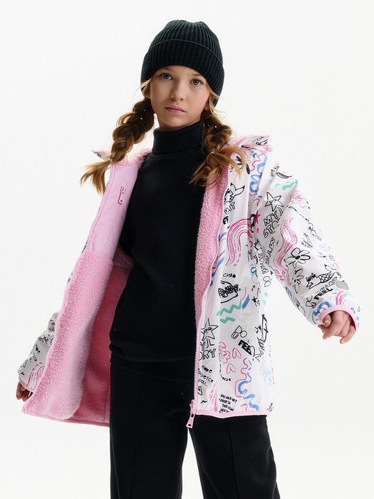 Внешняя сторона изготовлена из практичной курточной ткани, устойчива к ветру и повседневным нагрузкам. Внутренняя сторона выполнена из мягкого бербера — уютного и тёплого материала, который по тактильным ощущениям воспринимается как плюшевая куртка. Благодаря этому модель часто выбирают как меховую куртку для девочки на демисезон, без утяжеления и перегрева.
