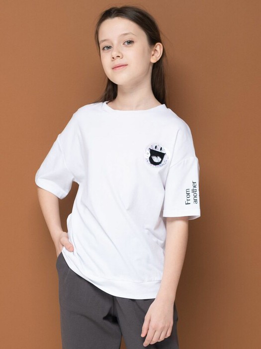 Мягкая, приятная к телу трикотажная футболка для девочки. Удобный и свободный, ведь прямой силуэт и спущенное плечо не стесняют движения. Белый цвет изделия не боится стирок и ежедневной носки. Хорошо сочетается с любыми брюками или юбкой.