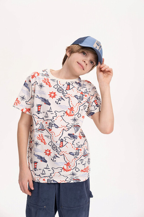 Футболка для мальчика прямого кроя - это идеальный выбор для активного ребенка. Вырез горловины обработан эластичной тканью — она прекрасно держит форму, не растягивается, при этом ребёнку удобно надевать и снимать футболку. Футболка украшена принтом в морском стиле. Спортивная футболка подходит как для подростков так и для малышей в детский сад. Подходит для любого времени года.