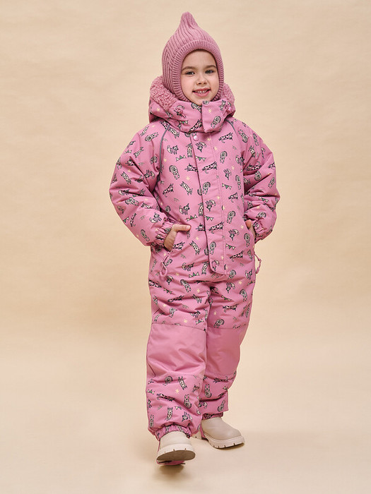 Комбинезон зимний детский из мембранной ткани для девочки. Модель свободного объёма с рукавами кроя реглан - ребёнку комфортно и не  стесняет  движения. На внешнюю поверхность материала нанесена водоотталкивающая пропитка (DWR), она задерживает грязь и влагу снаружи — ребёнок не промокнет от снега, а комбинезон легко отстирается. Также есть дополнительная пропитка на внутренней стороне ткани — для более надёжной защиты от промокания. Капюшон двухшовный, что обеспечивает анатомически правильную форму и комфортную посадку по голове. Капюшон не отстегивается, предусмотрена регулировка объема эластичными шнурами с пластиковыми стопперами. Внешний край капюшона декорирован мягким искусственным мехом, по текстуре напоминающим «барашка». Из этого же материала выполнена внутренняя подкладка капюшона, она комфортная, тактильно приятная. Удобная центральная застёжка на тракторную молнию. Тканевый стоппер защищает подбородок от зажима молнией. Фиксирующая строчка предохраняет планку от «заедания» в процессе застёгивания. Комбинезон тёплый — для оптимальной защиты от ветра и холода центральная молния дополнительно закрыта ветрозащитной планкой на кнопках и липучках (велькро). Спинка по талии присборена на внутреннюю резинку — комбинезон для девочки зимний безупречно садится по фигуре и не выглядит мешковато. Внутри комбинезона эластичные лямки — есть возможность снимать только верхнюю часть в помещении. Карманы с боковым входом закрываются на водонепроницаемую молнию со скрытыми звеньями — содержимое карманов не промокнет от снега во время активных игр на свежем воздухе. Внутри карманы утеплены мягким флисом. Замок дополнен тканевыми стопперами, что предохраняет его от разрыва. На пуллере эластичный запаянный шнур — ребёнку легко открывать и закрывать даже в варежках. Манжеты рукавов и брючин на комфортных широких резинках, это предохраняет от попадания внутрь снега. На муфтах брюк антискользящая резинка. Комбинезон дополнен съёмными силиконовыми штрипками. Область колен и нижняя часть спинки усилены более плотной тканью — можно смело кататься с горки и ползать на коленках сколько захочется. В каждом изделии нейм-лейбл! Ребёнок не потеряется и не потеряет комбинезон! Световозвращающие канты в проймах переда и спинки — безопасность в тёмное время суток. Модель красивого трендового цвета декорирована милым девичьим принтом. Комбинезон на молнии неприхотлив в уходе — ухаживать согласно указанным на вшивных ярлыках рекомендациям. Изделие выполнено из полиэстера с мембраной — оно не только защищает от холода и влаги, но и хорошо пропускает воздух, давая коже ребёнка дышать. Подкладка из мягкого, тёплого и дышащего флиса (по переду и спинке). В рукавах и штанинах подкладка из тонкого и гладкого полиэстера —  благодаря этому ребенку легко надевать комбинезон, руки и ноги не путаются в рукавах и штанинах, а легко проскальзывают. Зимний комбинезон детский идеален для маленьких девочек дошкольного и младшего школьного возраста. Рекомендуемый температурный режим: не ниже минус 25 градусов. В изделии использован один из высокотехнологичных утеплителей — феллекс 260 г/м2. Дышащие свойства мембраны: не менее 3000 г/м2/сут. — ребёнку будет комфортно на прогулке. Модель подходит для носки в детский сад, для прогулок и отд
