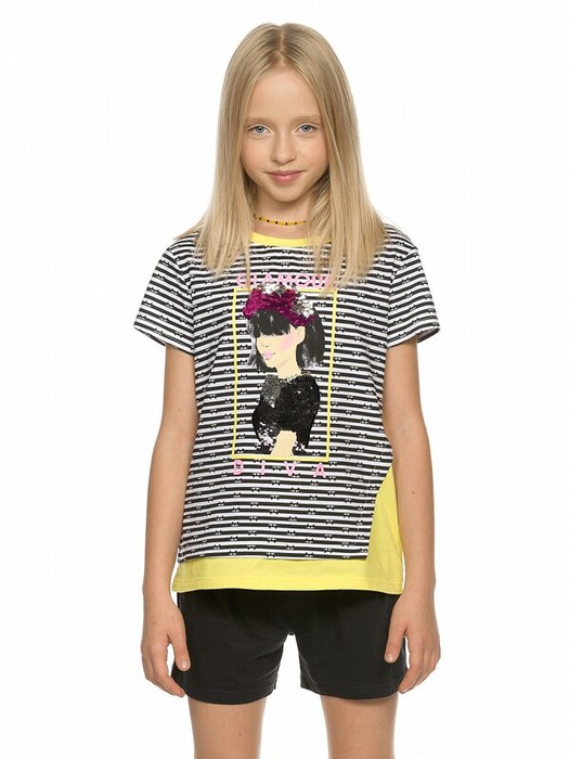 Комплект для девочек футболка и шорты из 100% хлопка. Футболка умеренного объема с мягкой линией плеча. Имитация многослойности - одна футболка, надетая поверх другой. Верхняя полосатая, с ассиметрично срезанным боковым швом и горловиной из рибаны в цвет нижней. Нижняя желтая. Принт с замаскированными в полоски мордочками кота. По центру вышивка из переворачивающихся пайеток и неоновый принт с глиттером, перевод Гламурная дива. Футболка с актуальными трендами сезона для самых продвинутых девчонок. Шорты умеренного объёма с защипами у пояса. Регулировка объема внутренним шнуром. Комплект можно носить по отдельности и это делает его универсальным.