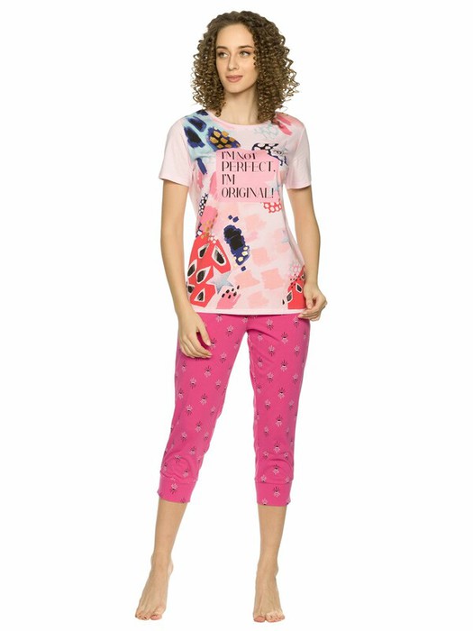 Комплект женский футболка и брюки. Футболка прямого кроя среднего объема. Мягкий стойкий принт с золотым металликом. Перевод Я не идеальная, я оригинальная.. Бриджи комфортного объема. По талии   на плоской внутренней резинке, по низу   манжеты шириной 7 см., all over принт.