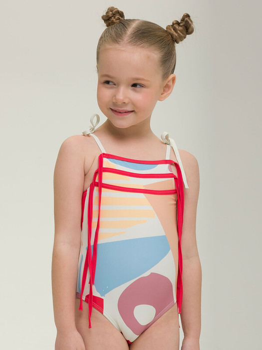 Купальник слитный для девочки. Мягкая эластичная ткань разработана специально для купальных костюмов и идеально садится по фигуре.  Быстро сохнет и практически нет выгорания на солнце. Тонкие завязывающие бретели позволяют регулировать купальник по росту девочки. Разноцветный принт колорблок и яркие завязки из пайпинга - настроение лета, теплого ветерка и солнца.