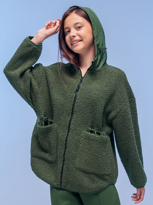 Флисовая куртка детская для девочки. Изделие выполнено в сочетании двух материалов: бербер-флиса с мягкой фактурой «барашка» и гладкой курточной ткани. Это один из наиболее актуальных трендов сезона. Капюшон и отделка вдоль застёжки из курточной ткани — максимум практичности. Ребёнок не промокнет, а ткань вдоль молнии не будет мараться при частом использовании. Толстовка детская модного оверсайз-силуэта со спущенным плечом подарит ребёнку комфорт и не будет стеснять его движений. Высокий воротник защищает шею от холода и ветра. По переду застёжка на центральную молнию с крупным пуллером — ребёнку просто застёгивать и расстёгивать. Тканевый стоппер защищает подбородок от зажима молнией. Низ изделия и низ рукавов окантованы эластичной тесьмой — они не растягиваются и сохраняют форму и отличный внешний вид надолго. Куртка с двойными накладными карманами: верхняя часть из основной ткани, внутренняя — из курточной — оригинально и стильно. Объём капюшона и объём внутренних карманов регулируется при помощи эластичной тесьмы со стопперами. Капюшон двухшовный, что обеспечивает анатомически правильную форму и комфортную посадку по голове. Оверсайз-куртка однотонная, без принта. За ней просто ухаживать. Оба материала состоят из полиэстера  — толстовка тёплая, лёгкая, мягкая, просто стирается и быстро сохнет, не выгорает и не скатывается, сохраняет отличную форму надолго. Куртка выполнена в зелёном цвете (актуальный оттенок хаки). Размерный ряд: 1 (86); 2 (92); 3 (98); 4 (104); 5 (110); 6 (116); 7 (122); 8 (128); 9 (134); 10 (140); 11 (146). Мягкая куртка идеальна для девочек дошкольного и младшего школьного возраста, а также девочек-подростков. Подходит для детского сада, прогулок, активного отдыха, спорта. Худи с капюшоном можно носить круглогодично: прохладным летом, осенью и весной (демисезон), зимой. Оно может заменить ветровку в начале осени или конце весны, а зимой послужит тёплым средним слоем одежды. Стильный и практичный подарок дочери, внучке или сестре на Новый год и любой другой праздник.