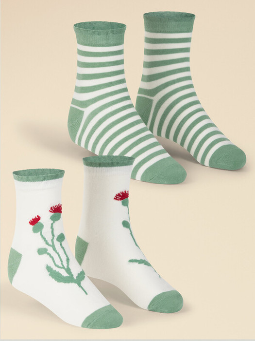 Стильный и красивый набор детских носков. В комплект входят 2 пары. Мягкая резинка не пережимает ногу, при этом носки надёжно зафиксированы и не сползают. По краю резинки небольшая декоративная сборка — модный тренд. В составе ткани преобладает хлопок — носки мягкие, отлично пропускают воздух, позволяя коже ребенка дышать. Благодаря полиэстеру и эластану носки износостойкие, хорошо тянутся, прекрасно переносят многочисленные стирки. Милые носки подходят для повседневной носки в школу, детский сад, а также для спортивных тренировок и прогулок. Одна пара в наборе в зелёно-бежевую полоску, вторая — бежевая с зелёными пяткой и мыском, украшена актуальным вытканным ботаническим узором в виде цветов. Модные носки станут изящным дополнением образа. Размерная линейка: 12-14, 14-16, 16-18, 18-20, 20-22. Подходят для круглогодичного применения. Набор носков детских станет отличным подарком для ребёнка на любой праздник. Выбирайте нужный размер по таблице размеров на фото. Цвет товара на экране вашего устройства может отличаться от цвета изделия вживую. Товар возврату и обмену не подлежит.