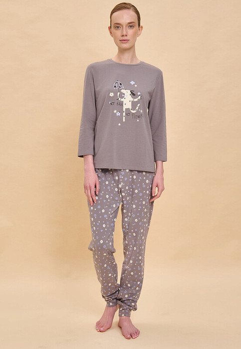Костюм пижамный женский. В составе ткани преобладает высококачественный хлопок — комплект для сна мягкий, гипоаллергенный и хорошо пропускает воздух. В хлопковой пижаме вам будет тепло и уютно во время сна. Эластан помогает модели надолго сохранить первоначальную форму. Джемпер и брюки умеренного объёма, плечо немного спущено, рукава широкие и свободные — в пижаме очень удобно спать. В поясе брюк мягкая и широкая резинка — не перекручивается и не давит. Отделка горловины из эластичной рибаны — она не растягивается, пижаму удобно надевать и снимать. Манжеты брючин широкие, из основной ткани — не передавливают ногу. Хлопковая пижама украшена милым, «няшным» принтом в виде танцующей собачки с зонтиком, надпись переводится: «нет дождя — нет цветов» — поймайте позитивное настроение! Пижамный костюм неприхотлив в уходе. Принт мягкий и прочный, без проблем переносит многочисленные стирки. Пижама женская с брюками подходит как для сна, так и просто для отдыха дома. Помните о правильном уходе за изделием: рекомендуется стирать при температуре не выше 30 °C, без предварительного замачивания, с изнанки. Это поможет сохранить качество и цвет пижамы на длительное время.