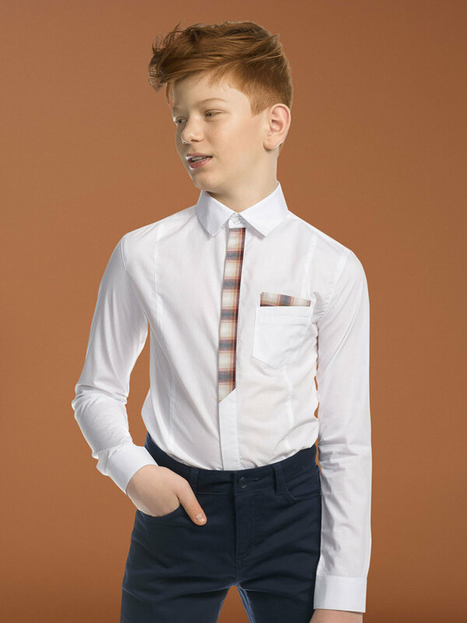 Школьная рубашка с длинным рукавом для мальчика прилегающего силуэта. Натуральный хлопок в составе позволяет телу дышать, ткань приятна на ощупь и проста в уходе – быстро сохнет и легко гладится. Воротник не давит в застегнутом виде. Изюминка модели – имитация клетчатого галстука и платка в кармане. Идеальна для создания делового стиля. Отлично смотрится в паре с жилетом или пиджаком – классический вариант школьной одежды.