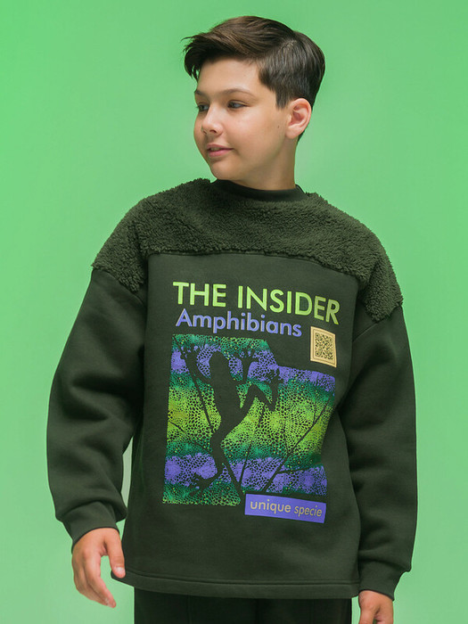Свитшот детский для мальчика. Свободный джепер со спущенным плечом подарит ребёнку комфорт и не будет стеснять его движений. Объёмная толстовка выполнена в сочетании двух материалов: футера с начёсом и мягкого бербер-флиса (фактура «барашка») на кокетке переда и спинки. Комбинация материалов разной фактуры — актуальный модный тренд. Манжеты и отделка горловины выполнены из эластичной рибаны. Она не растягивается, прекрасно сохраняет форму, при этом ребёнку удобно надевать и снимать свитшот. За толстовкой просто ухаживать. Свитшот с принтом по переду выполнен из ткани с высоким содержанием качественного хлопка — он мягкий, тёплый и хорошо пропускает воздух. Полиэстер помогает сохранить цвет и первозданный внешний вид надолго. Оригинальный принт в виде лягушки с надписями «инсайдер амфибия» и «уникальный вид» дополнен QR-кодом, при сканировании которого можно прочитать уникальные научные факты о лягушках. Принт эластичный и прочный, не боится частых стирок. Свитшот с начёсом выполнен в универсальном цвете хаки. В линейке представлены следующие размеры: 1 (86); 2 (92); 3 (98); 4 (104); 5 (110); 6 (116); 7 (122); 8 (128); 9 (134); 10 (140); 11 (146). Оверсайз-свитшот подходит как для маленьких мальчиков, так и для подростков. Его можно носить круглый год: осенью и весной (демисезон), зимой, в прохладную погоду летом. Толстовка идеальна для детского сада, прогулок, активного отдыха, дома. Детский свитшот — отличный подарок сыну, брату, внуку или племяннику на Новый год и любой другой праздник.