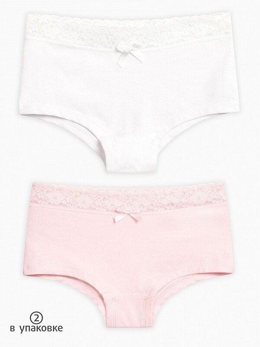 Трусы шорты со средней посадкой для девочки. Комплект из 2-х штук. Приятная на ощупь ткань с высоким содержанием хлопка и небольшим содержанием эластана – трусы сохраняют форму даже после частых стирок. Широкая резинка из мягкого эластичного кружева не передавливает тело и не натирает кожу. Лаконичный декор в виде атласного бантика - тактильно приятная изюминка. Для романтичных девочек.