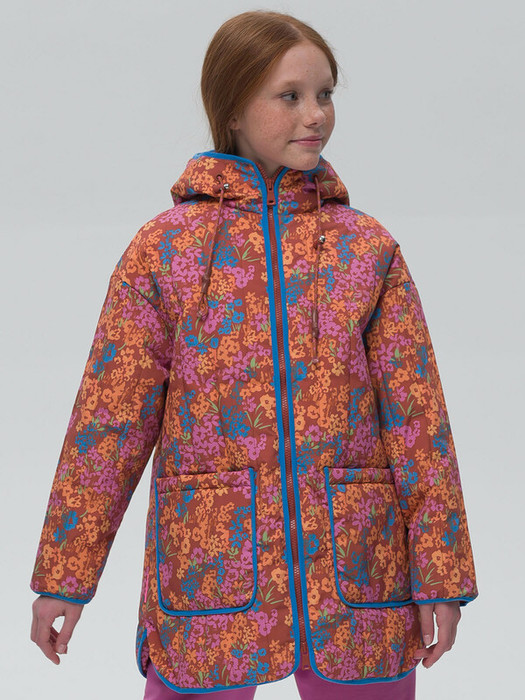 Удлиненная весенняя ветровка, стеганая вертикальными параллельными строчками с синтепоном 150 гр. Силуэт: прямой, мягкий оверсайз. Фигурная линия низа делает силуэт более мягким. Водоотталкивающая пропитка (DWR) наносится на внешнюю поверхность ткани и задерживает грязь и влагу снаружи. Дополнительный слой на внутренней стороне ткани не позволяет ребенку промокнуть. Наличие в составе ткани мембраны делает куртку максимально комфортной при носке. Хлопковый трикотаж в капюшоне и по стану - хорошая воздухопроницаемость, ребенок не вспотеет, в рукавах подклад из полиэстера - для удобства надевания. Капюшон двухшовный - хорошо сидит на голове, неотстегивающийся. Объём капюшона регулируется двухцветным шнуром с декором, который хочется потрогать, рассмотреть, поиграть. Центральная застежка на тракторную молнию с двумя пуллерами. Не заедает и удобно расстегивать! Тканевый стоппер защищает подбородок от зажима молнией. Прямой рукав слегка заужен книзу и окантован эластичной тесьмой. Накладные карманы на синтепоне - р