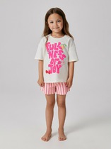 Пижама для девочки из трикотажного полотна "кулирка", состоящая из футболки и брюк. Футболка - из гладкокрашеного полотна, слега расширенная и укороченная, с втачными короткими рукавами, горловиной овальной формы, обработанной втачной планкой и принтом в центре переда, выполненным в технике шелкографии. Брюки из полотна с набивным тематическим рисунком, длинные, с эластичной тесьмой по талии и нижним срезами.
