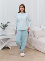 Пижама женская из трикотажного полотна «кулирка» в комбинации двух видов полотен: с набивным рисунком и гладкокрашенного в единой цветовой гамме, состоящая из футболки и брюк. Футболка - из гладкокрашенного полотна, классического покроя, с короткими втачными рукавами, горловиной овальной формы и принтом на полочке, выполненным в технике «шелкографии». Горловина, низ рукавов обработаны узким притачным кантом контрастного цвета.Брюки - длинные, с эластичной тесьмой по талии и притачными манжетами, которые обработаны с узким кантом контрастного цвета в соединительных швах.
