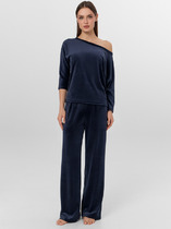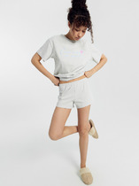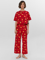 Пижама женская , состоящая из футболки и брюк. Футболка классического покроя, с короткими втачными рукавами, горловиной овальной формы, обработанной втачной планкой, фигурной линией низа и принтом в центре переда, выполненным методом шелкографии. Брюки - длинные, с эластичной тесьмой верхнему и нижним срезам.