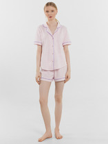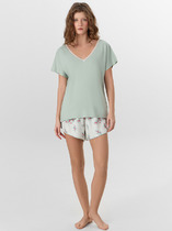 "Костюм-пижама для беременных и кормящих женщин. Футболка с V-образной горловиной, короткими рукавами, со сборкой на резинку спереди, под грудью. Шорты с уменьшенной высотой спереди для их комфортного расположения под животом, расширенные книзу.