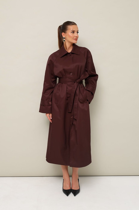 Плащ в длине миди, выполнен из ткани с водоотталкивающей и грязеотталкивающей обработкой. Силуэт слегка расширенный к низу. Отложной воротник с цельнокроеной стойкой. Центральная застёжка на петли и пуговицы. Спереди функциональные карманы-листочки. Рукава кроя реглан, по низу обработаны паты с застежкой на пуговицы. Спинка со средним швом со шлицей по низу. Плащ на подкладке.