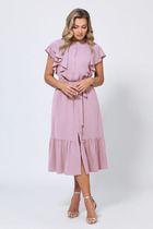 Платье женское прилегающего силуэта, расклешенное к низу. По переду платья нагрудные складки, воротник пиджачного типа, застежка с имитацией запаха. Спереди по талии отдельная фигурная баска с клапаном. Спинка со средним швом и талиевыми вытачками. Рукав одношовный 7/8. Юбка притачная по талии полусолнце. В боковом шве платья застежка на потайную тесьму молнию.